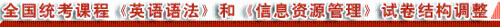 | 為進一步實現全國統考課程《英語語法》(課程代碼:0831)和《信息資源管理》(課程代碼:2378)的考核目標,自2009年7月考試起,全國高等教育自學考試指導委員會上海命題中心將對《英語語法》和《信息資源管理》兩門課程試卷結構進行部分調整。[全文] |