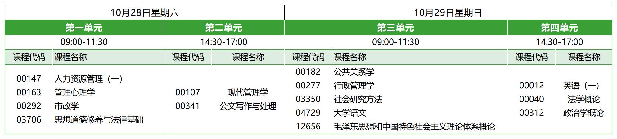 北京自考專科行政管理專業(yè),專業(yè)代碼01A0302,2023年10月自考考試時間為10月28日-29日,上午9:00-11:30,下午14:30-17:00,本次考期共開考14門科目,具體科目安排如下: