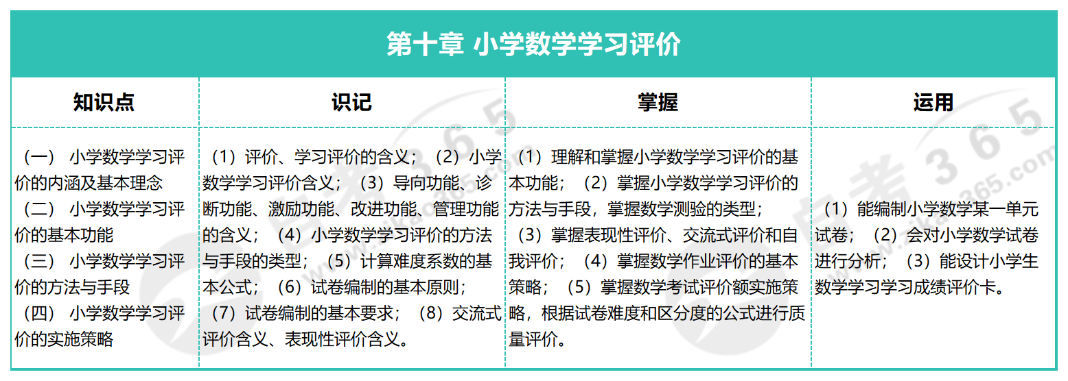 根據自考小學數學教學研究考試大綱的要求,考生可以將復習分為三個層次:識記、掌握、運用。具體考點的考核要求可參考下表。第十章涉及許多識記類考點,需要考生額外注意。