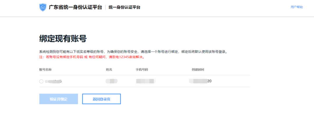 人臉識別核驗完成。如未在廣東省統一身份認證平臺注冊賬號,需先注冊賬號;如已注冊,可綁定現有賬號。