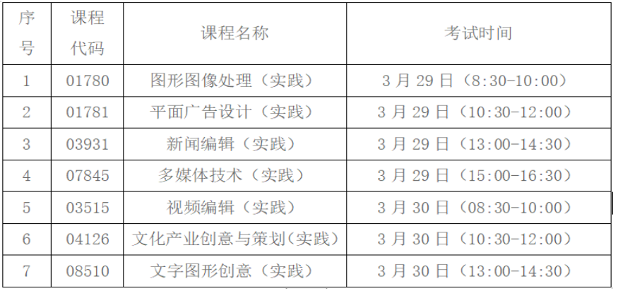 2025年上半年由北京北大方正軟件職業(yè)技術(shù)學(xué)院主考的高等教育自學(xué)考試傳播與策劃專業(yè)實踐考核共有7門考試科目,經(jīng)我辦研究決定,計劃定于3月29日、30日舉行考試。現(xiàn)將具體考試計劃安排如下:
