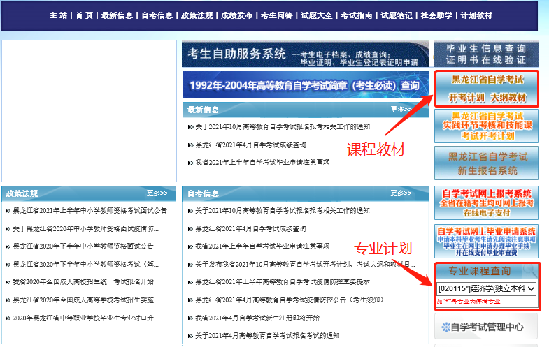 由于黑龍江自考專業計劃所包含的科目不同,所以考試需要的教材也不同。考生可登錄黑龍江省招生考試信息港自考頻道查看報考專業的專業計劃及課程教材(如下圖所示),或者直接點擊→2021年10月黑龍江自考面向社會開考專業及主考院校一覽表,找到所報考專業的專業計劃,并點擊→關于發布黑龍江省2021年10月自考開考計劃、考試大綱和教材目錄的通知,通過課程代碼或名字搜索相應的教材版本。