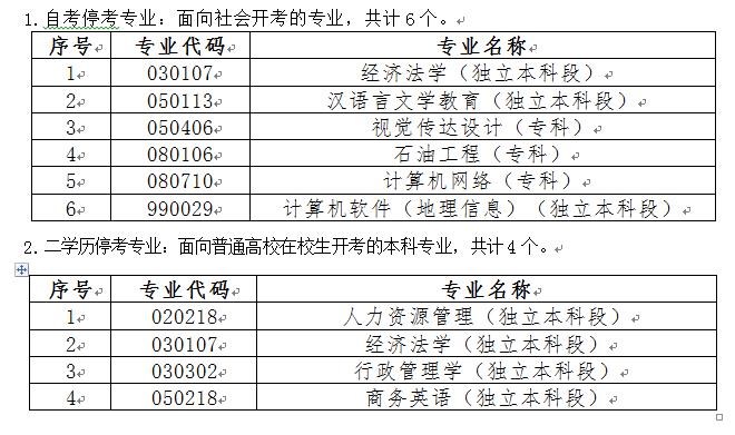 根據《教育部辦公廳關于印發〈高等教育自學考試專業設置實施細則〉和〈高等教育自學考試開考專業清單〉的通知》要求,對考生數量少、現專業名稱與《專業清單》不符的專業應予以停考。依此原則并結合近幾年我省各專業考生報考情況,經與有關主考學校商定,現就停考有關事宜通知如下: