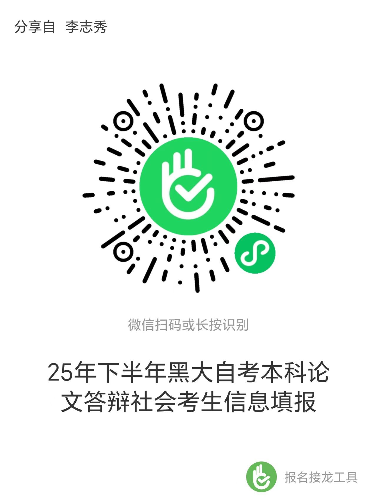 2.掃描下方二維碼,如實填寫報名信息,并提交自考成績單(成績查詢網址:https://zxks.hljea.org.cn/kszzfw/home/login)。