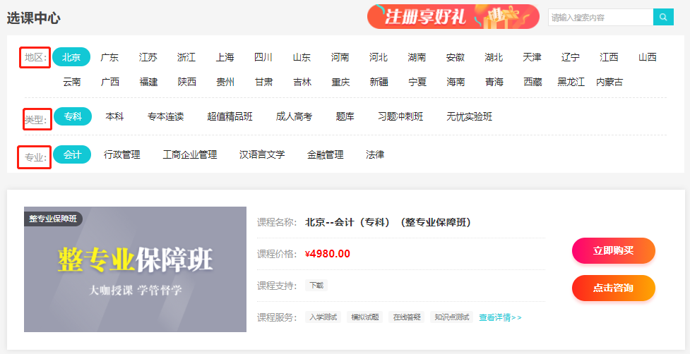 1進入自考365網校選課中心,選擇輔導類別;