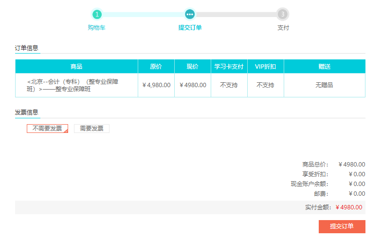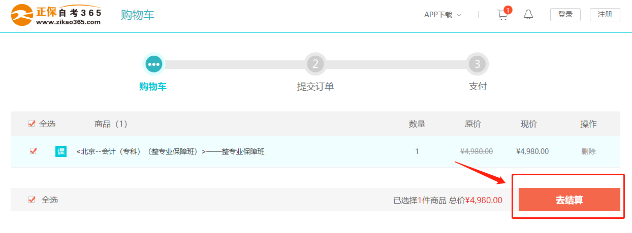 3進入購物車,確認購買課程,點擊“去結算”;