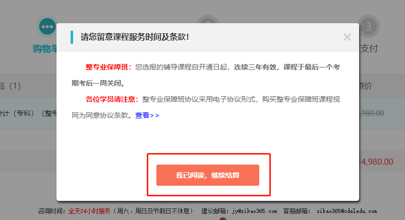 4閱讀課程服務時間及條款,點擊“我已閱讀,繼續結算”;