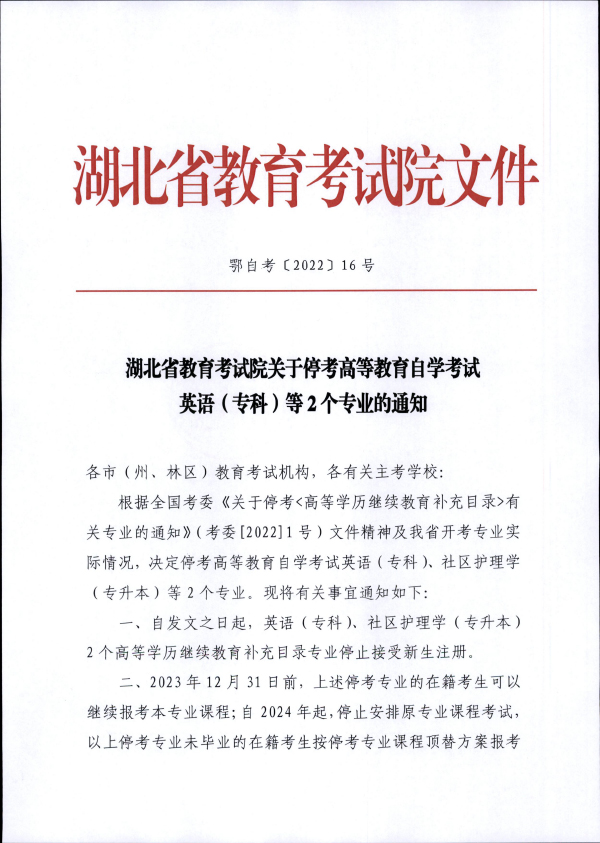 2022年湖北省關于停考高等教育自學考試英語(專科)等2個專業的通知