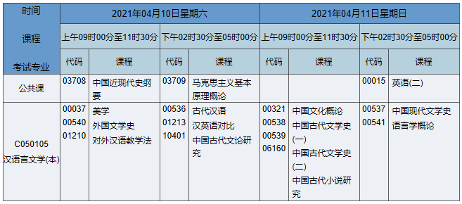 2021年4月湖南自考本科漢語言文學專業考試時間為2021年4月10日-11日,2021年4月湖南自考本科漢語言文學專業課程安排如下:
