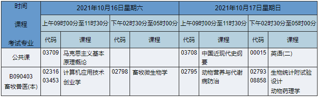 2021年10月湖南自考本科動物醫學(原畜牧獸醫)專業考試時間為2021年10月16日-17日,2021年10月湖南自考本科動物醫學(原畜牧獸醫)專業課程安排如下: