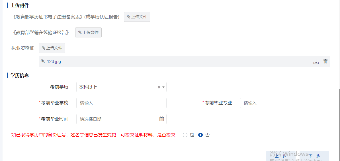 注:如已取得學歷中身份證號、姓名等信息發生變更,可選中“是”,彈出的變更前信息中,輸入相關信息,提交證明材料,點擊“下一步”按鈕,彈出如下圖所示窗口。