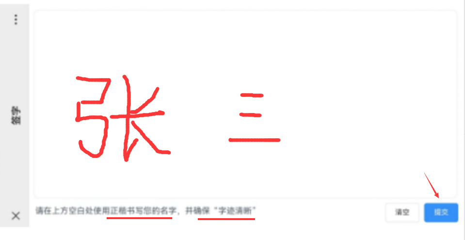 手寫輸入自己的名字(必須規范書寫并確保字跡清晰),點擊“提交”按鈕彈出如下圖所示窗口。