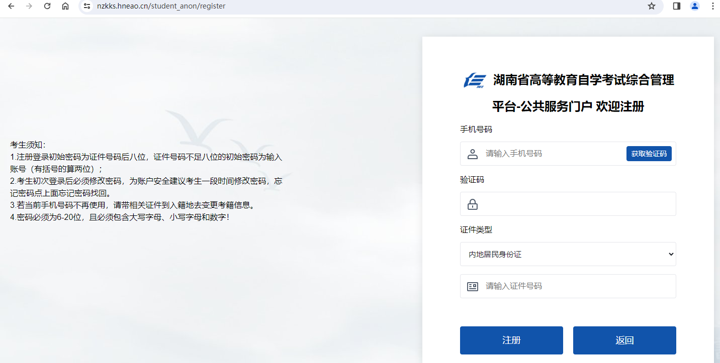 自2024年1月起,啟用“湖南省高等教育自學考試綜合管理平臺-公共服務門戶”(https://nzkks.hneao.cn)(以下簡稱“湖南自考服務平臺”)用作湖南自考考生使用的網站,為了更好的服務新入籍考生,特制定本《新生入籍注冊操作指南》。
