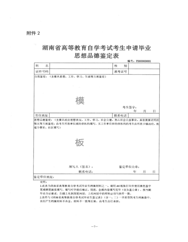 1.《湖南省高等教育自學考試考生申請畢業思想品德鑒定表》(附件1)。考生可以提前在“湖南自考服務平臺”中的“畢業管理”欄下載(每位考生的思想品德鑒定表都有自己的防偽碼,請考生務必登錄自己的賬號下載表格),用 A4 紙張打印后按要求填寫并加蓋公章(無鑒定單位公章無效)??忌窗匆笸瓿伤枷肫返妈b定導致畢業審核不通過,后果由考生自行承擔。思想品德鑒定表原件將在領取畢業證時與《湖南省高等教育自學考試畢業生登記表》一并封存到考生檔案袋中。(請妥善保存)