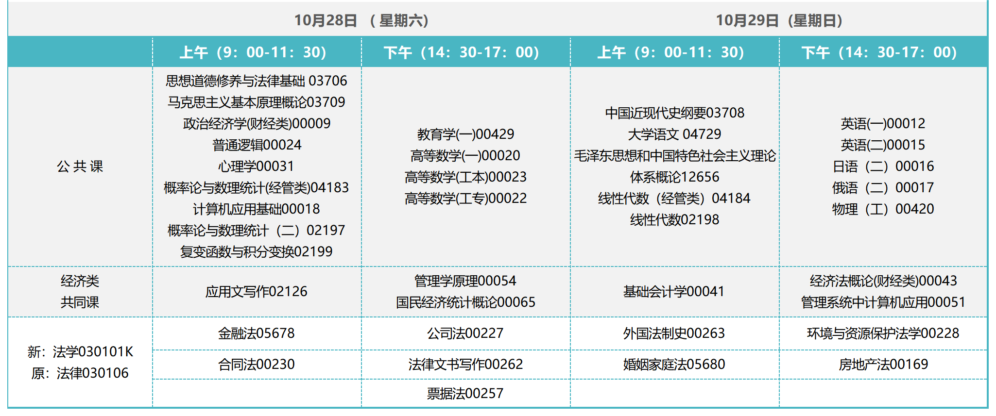 2023年10月吉林自考本科法學專業,專業代碼為030101K,考試時間為10月28日、29日,上午考試安排在9:00-11:30,下午考試安排在14:30-17:00。