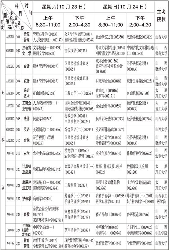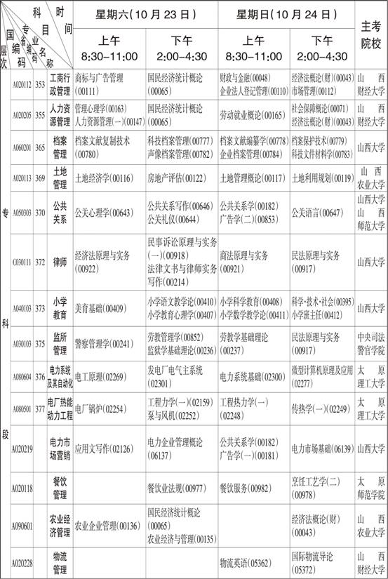 首頁 > 考試安排> 山西考試安排 > 山西2010年10月自考課程考試安排表