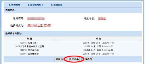 8、在“生成訂單”中選擇要付費的考生科目,生成付費訂單。