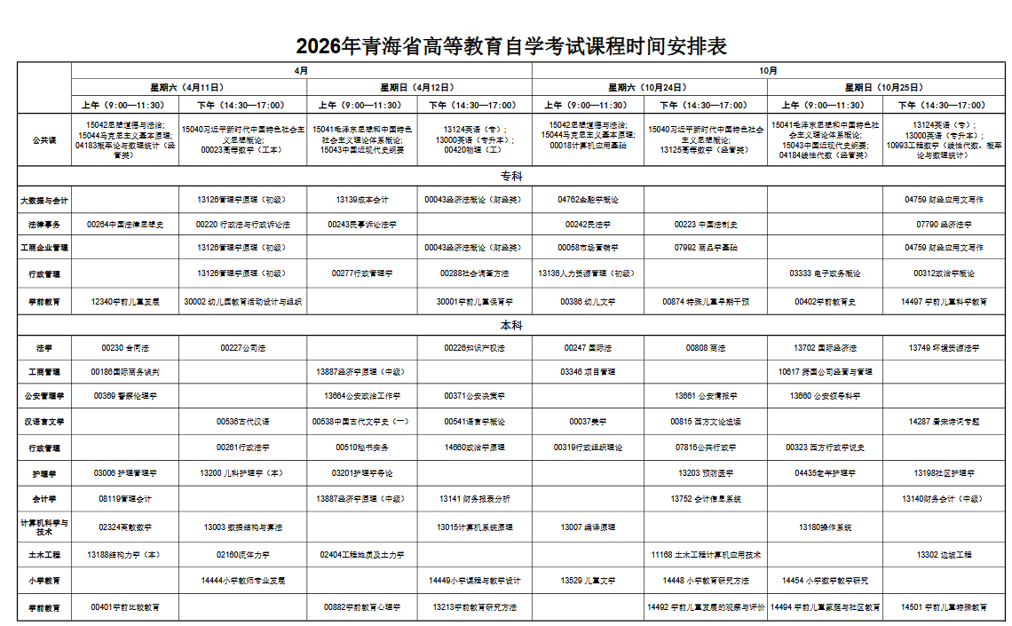 2026年青海省高等教育自學(xué)考試課程時(shí)間安排表