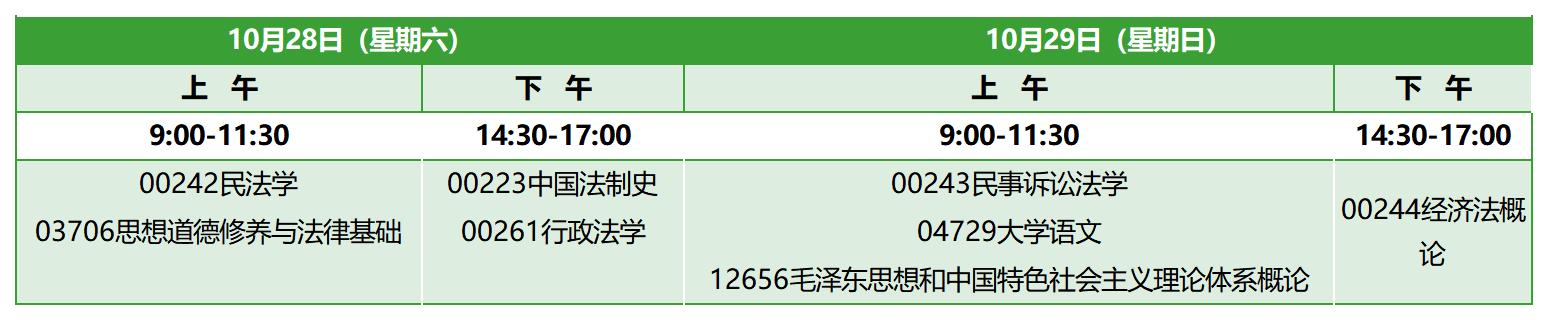 山東自考??品墒聞?wù)專業(yè),專業(yè)代碼580401,2023年10月自考考試時(shí)間為10月28日-29日,上午9:00-11:30,下午14:30-17:00,本次考期共開(kāi)考8門課程,具體科目安排如下: