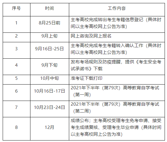 根據2021年下半年(第79次)上海市高等教育自學考試相關安排,現將重要工作日程公布如下,請考生關注上海市教育考試院“上海招考熱線”網站(www.shmeea.edu.cn)和各主考高校網站通知,切勿錯過報名、轉免考、畢業申請等業務辦理時間。若日程有變動,請以上海市教育考試院和各主考高校發布的最新通知為準。