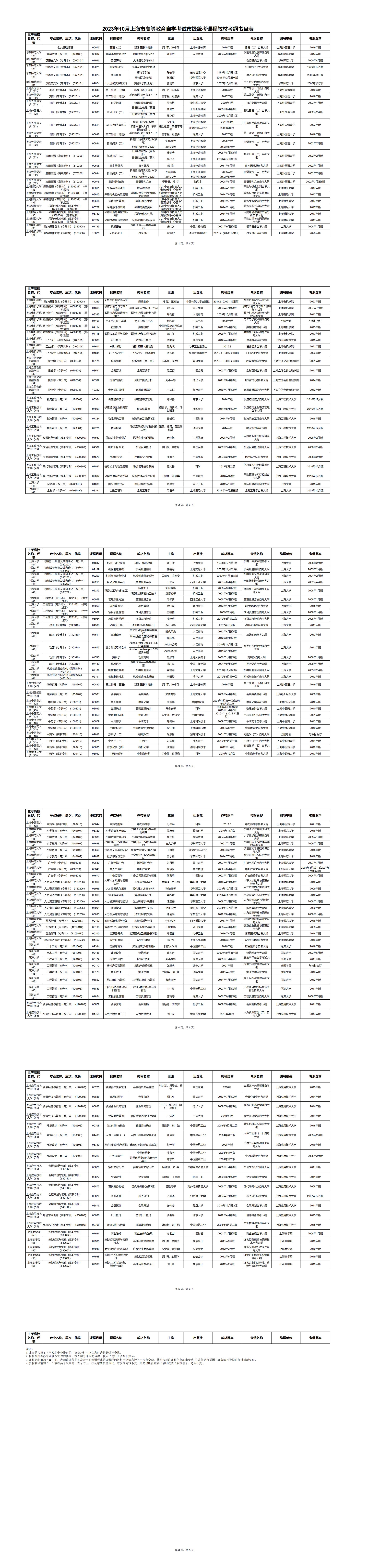 2023年10月上海市高等教育自學考試教材考綱書目表
