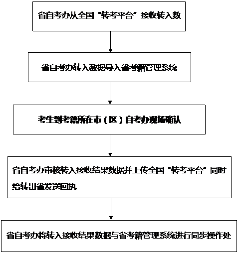 (一)省自考辦收到轉出地省級考辦通過全國“轉考平臺”遞送給我省的轉入考生電子檔案后,于規定日期內,將轉入信息導入省考籍管理系統。