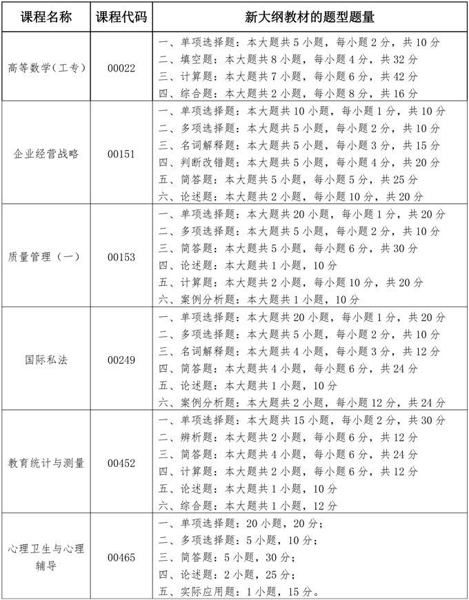 根據(jù)教育部考試中心的通知,自2019年4月考試起,部分全國統(tǒng)考課程將啟用新的大綱和教材。按照新大綱和教材要求,部分全國統(tǒng)考課程試卷結(jié)構(gòu)調(diào)整如下: