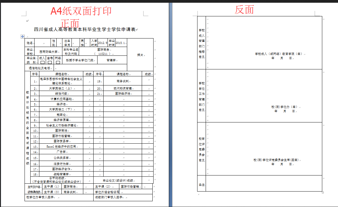 (二)完成網上信息申報后,學院將在2個工作日內進行初審,學生須及時關注,審核未通過的須按頁面提示信息在申請時限內修改后再次提交,直至審核通過。審核通過的學生方可打印《基本信息登記表》和《四川省成人高等教育本科畢業生學士學位申請表》(后面簡稱學位申請表)。《學位申請表》為正反兩面,須按打印設置要求使用A4紙雙面打印如圖: