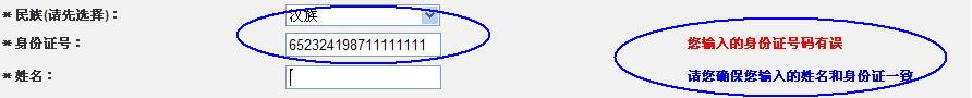 4.本系統要求考生先選擇民族,根據民族確定姓名的填寫形式,系統對身份證進行了驗證,請您仔細輸入且確保您所填寫的姓名和您的身份證一致