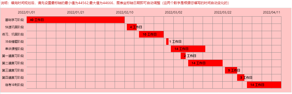 學(xué)習(xí)計(jì)劃倒推表時(shí)間從2022年1月1日開(kāi)始,到2022年4月15日結(jié)束,按照時(shí)間規(guī)劃事項(xiàng)、學(xué)習(xí)開(kāi)始時(shí)間、學(xué)習(xí)結(jié)束時(shí)間、學(xué)習(xí)總時(shí)長(zhǎng)、學(xué)習(xí)重點(diǎn)及核心目標(biāo)等多個(gè)維度拆解,幫助大家高效且科學(xué)地進(jìn)行復(fù)習(xí),大家快來(lái)按計(jì)劃學(xué)習(xí)吧!
