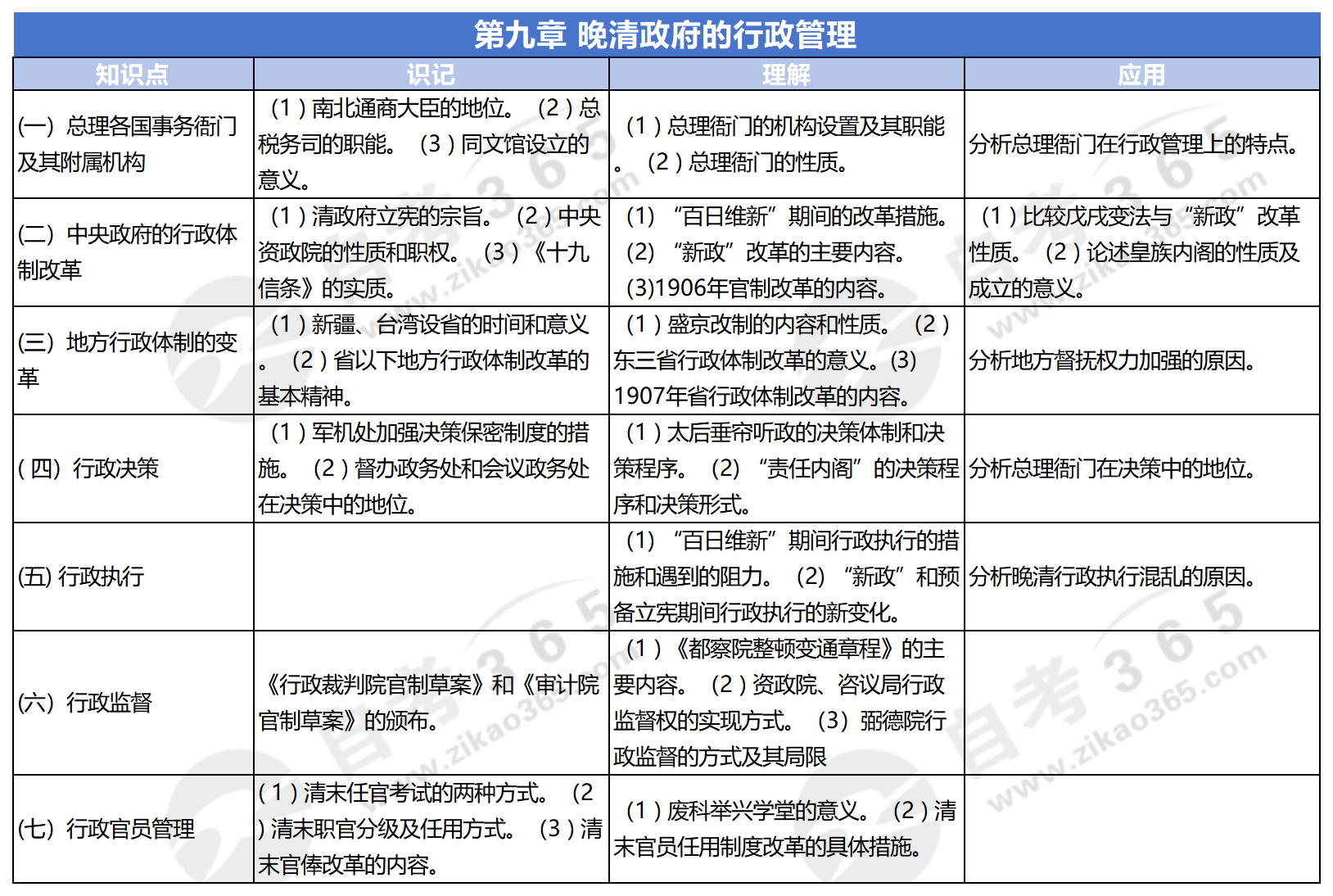 自考中國行政史這一科,教材各章節考點都要好好掌握。中國行政史教材第九章-晚清政府的行政管理,考生應著重學習以下知識點,并按理解應用要求,把握好學習程度,這樣就能更有重點地學習,更省心省力。