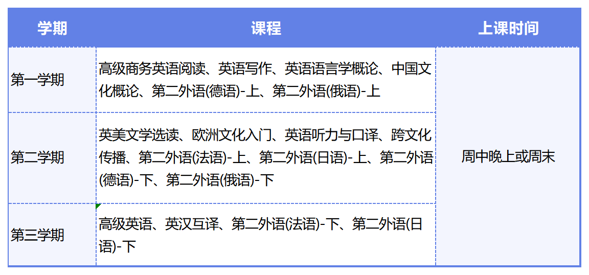 包含以下科目:高級商務英語閱讀、英語寫作、英語語言學概論、中國文化概論、英美文學選讀、歐洲文化入門、英語聽力與口譯、跨文化傳播、高級英語、英漢互譯、第二外語(德語)-上、第二外語(俄語)-上、第二外語(日語)-下、第二外語(法語)-下