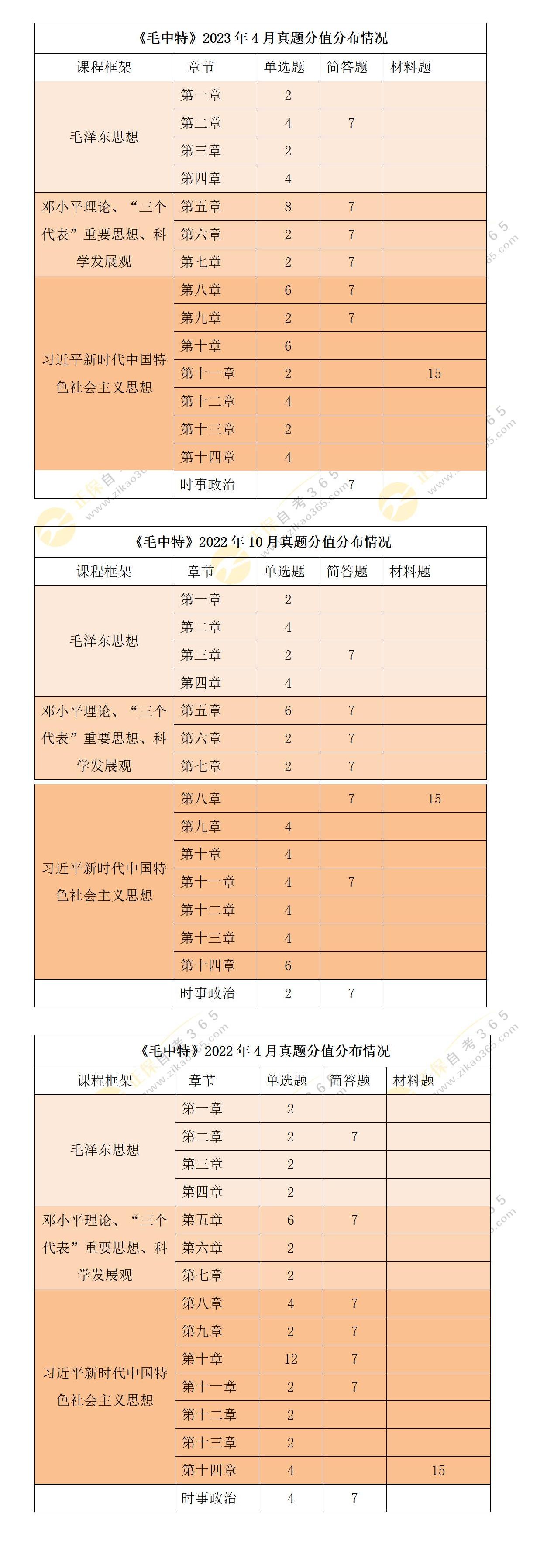 我們先看下近三個考期自考毛中特試題的題量分值分布情況: