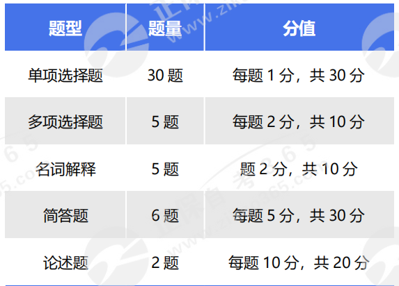 近幾年,考試題型和分值比例基本沒有變化,難度適中,選擇題考點較多,可以涉及到考試大綱規定的所有內容。名詞解釋和簡答題考點較為固定,論述題出題趨于靈活化。