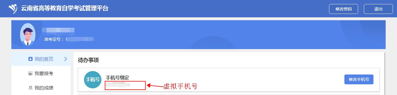 2.特殊考生登錄后,如考生有手機號的,需要綁定手機號,沒有手機號的綁定手機號的位置顯示系統生成的虛擬手機號。