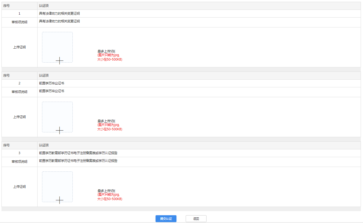 第二步:上傳證明材料,根據系統提示,上傳前置學歷證明材料信息,如有多個學歷,建議上傳最高學歷證明材料。