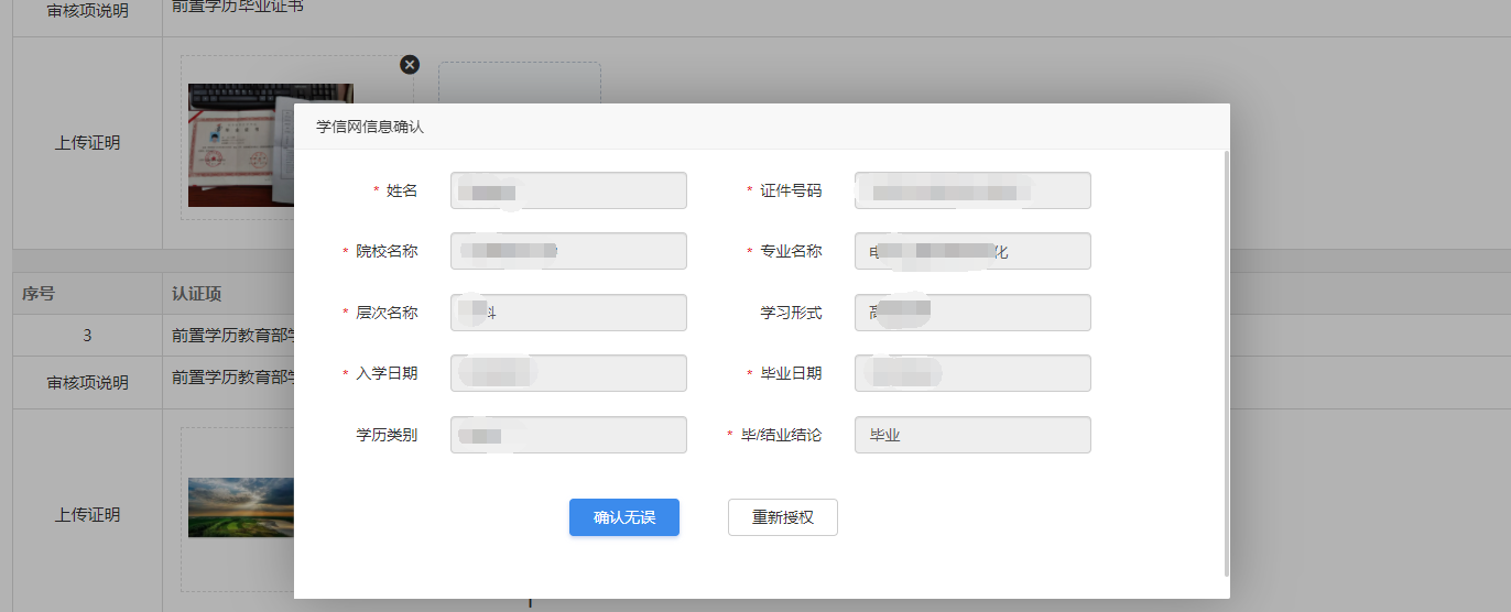 1.如查詢到學歷信息,系統展示查詢到的學歷信息,確認無誤后,點擊“確認無誤”按鈕。