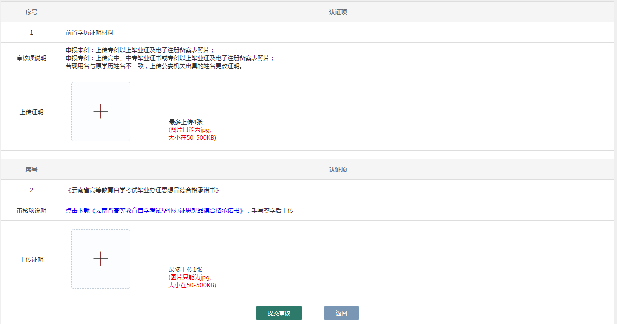 第三步:上傳證明材料(每個考生的證明材料不一致,根據自己的實際情況上傳證明材料并提交審核即可):