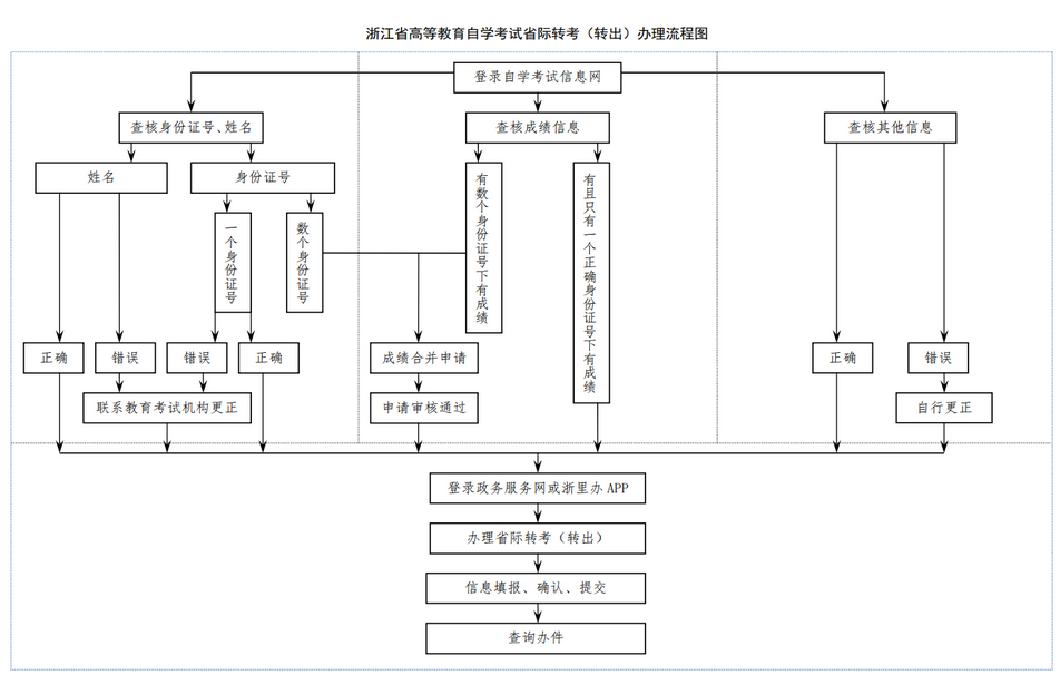 一、考生在辦理省際轉考(轉出)申請登記前,先通過浙江省教育考試院自學考試信息網(https://zk.zjzs.net)查詢核對個人信息(姓名、身份證號、準考證號等)和課程成績信息。如信息有誤,請于8月18日8:30-20日16:30期間自行更正或申請更正。